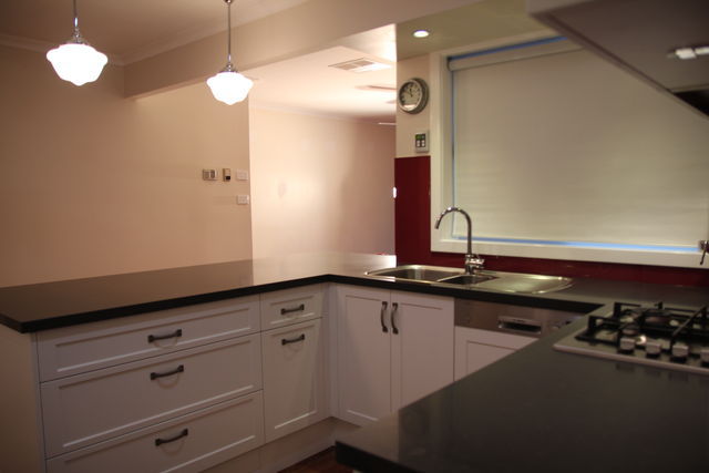 This kitchen creates a high contrast between the Ultra Finish high gloss white doors and the dark Caesar Stone bench tops. The black sink ties in with the stone while the splashback provides an interesting texture against the gloss panels. A roller shutter appliance cabinet was included to hide away the kettle, toaster and other appliances.