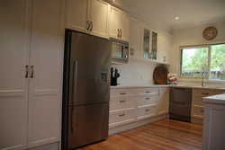 This kitchen features textured white thermo-foil doors, with a 40 mm Raven Caesar stone bench top. It is a Modern French Provincial style and includes a wall oven and separate gas cook top.